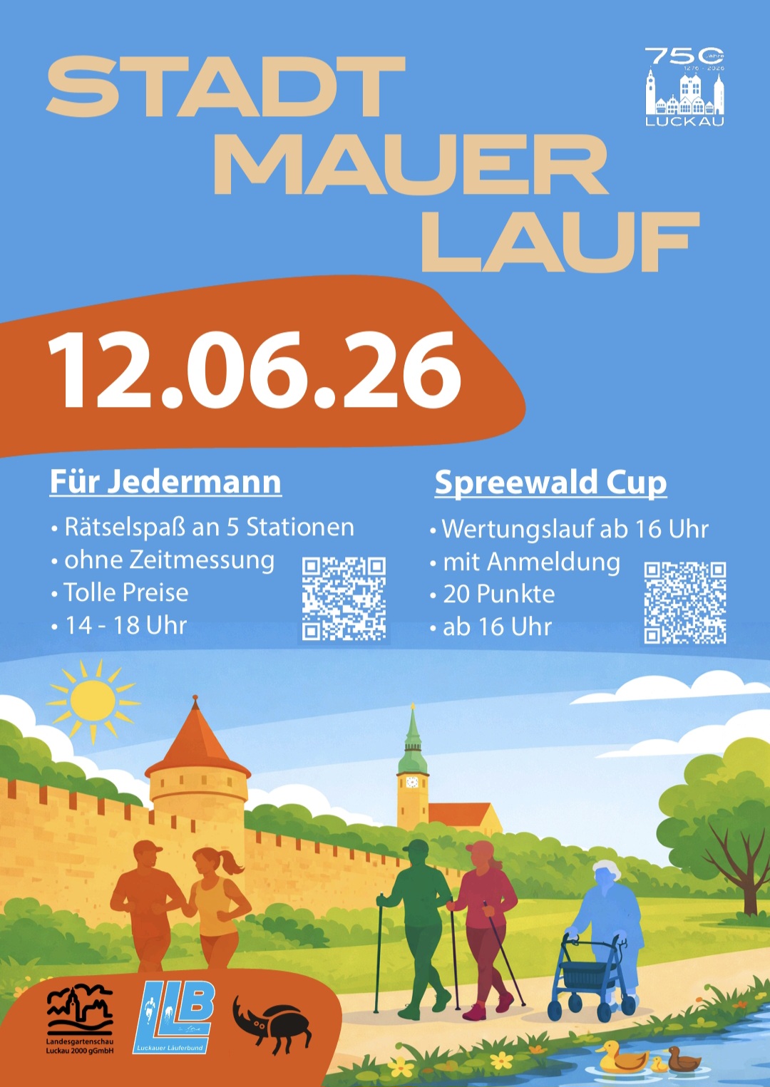 - Im Rahmen der Festwoche zum 750-jährigen Stadtjubiläum von Luckau findet am 12. Juni 2026 der 1. Stadtmauerlauf statt. Start ist um 16:00 Uhr auf dem historischen Stadtring – eine rund 2 Kilometer lange Strecke, die entlang der Luckauer Stadtmauer führt. Eine Zeitmessung erfolgt nicht! Der Lauf Teil der Spreewaldcup-Laufserie 2026. Unabhängig von der gelaufenen Distanz erhalten alle Teilnehmenden die volle Punktzahl von 20 Punkten.